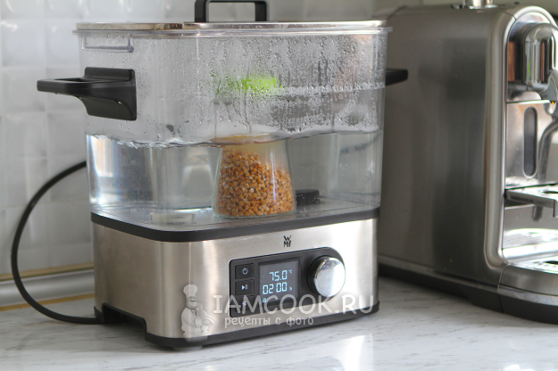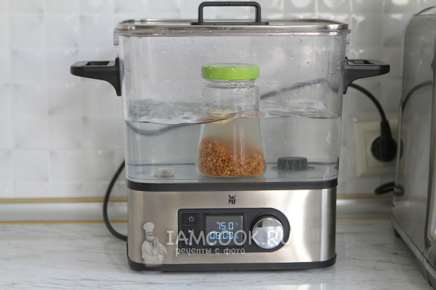 Нагрейте воду до 75 градусов. Когда вода нагреется до нужной температуры, установите банку с гречкой и готовьте 2-8 часов.