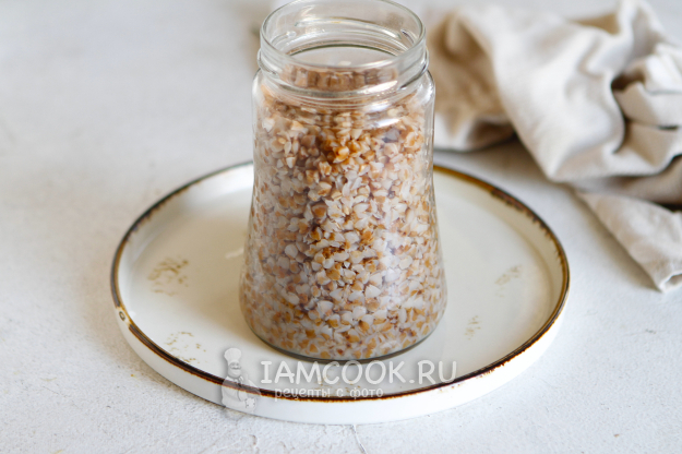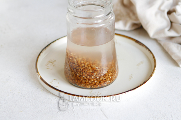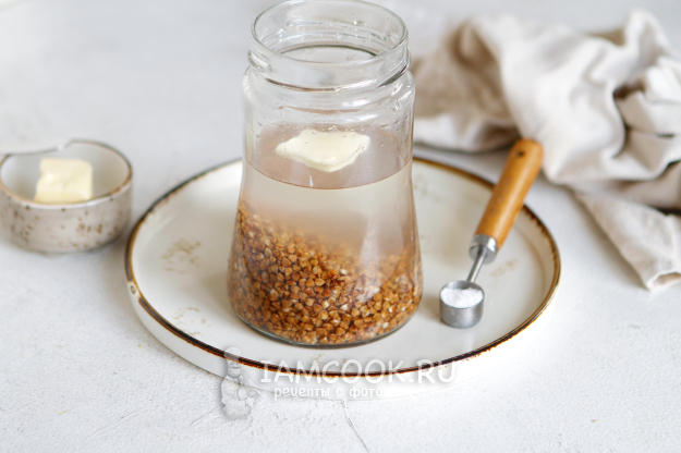 Объем банки должен быть чуть больше общего веса продуктов. В банку переложите гречку и влейте 200 г воды.