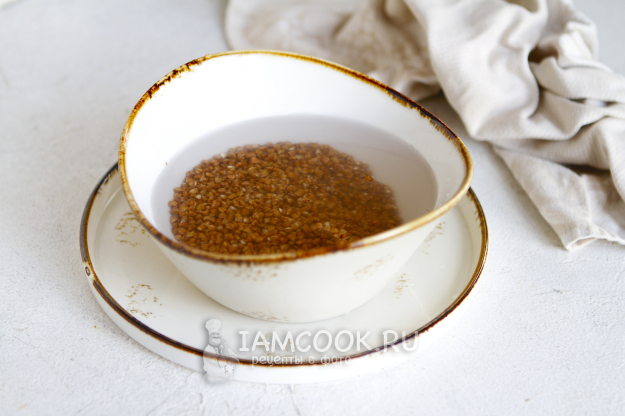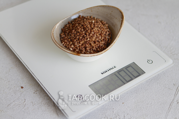 Гречку я буду готовить в банке, а для этого рецепта на 100 г крупы необходимо добавить 200 г воды. Отмерьте необходимое количество крупы.