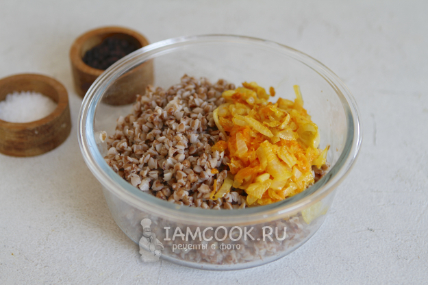 В чашу переложите гречку с овощами. Добавьте специи по вкусу (соль, черный молотый перец).
