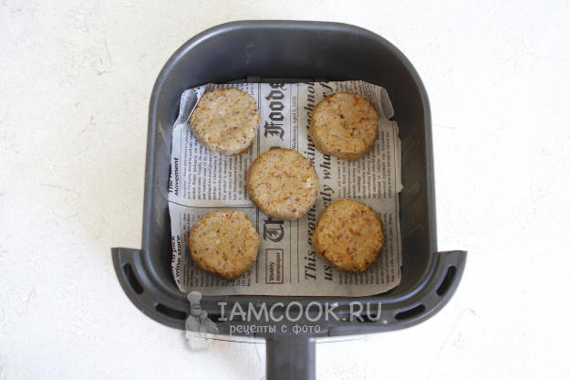 Выложите котлеты в чашу аэрогриля и слегка сбрызните маслом (1 ст. л.).