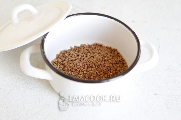 Крупу гречневую промойте под проточной водой, откиньте на дуршлаг, а затем переложите в кастрюлю или сотейник.