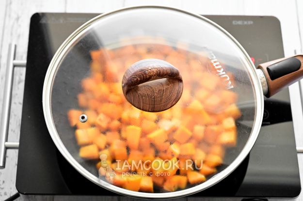 В процессе тушения тыква выделит жидкость и будет тушиться в собственном соку. Если вам покажется, что жидкости мало, то капните немного воды в сковороду (примерно 100-120 мл).