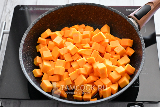 Отправьте в раскаленное масло кубики тыквы и обжарьте её слегка, примерно 3-5 минут, периодически помешивайте.