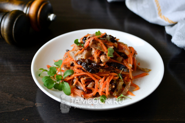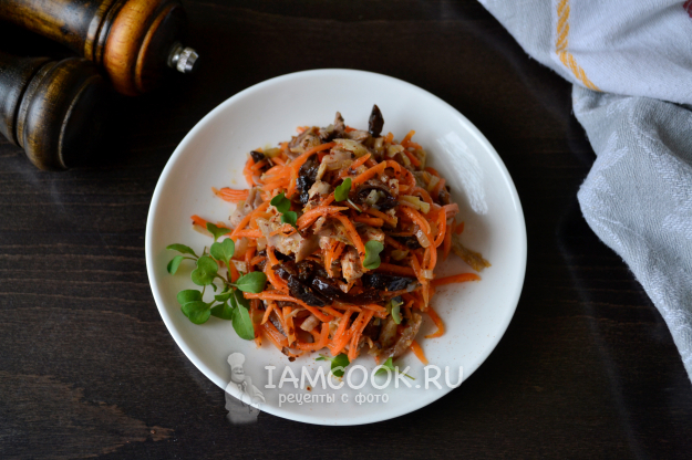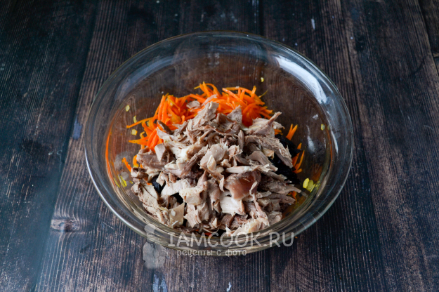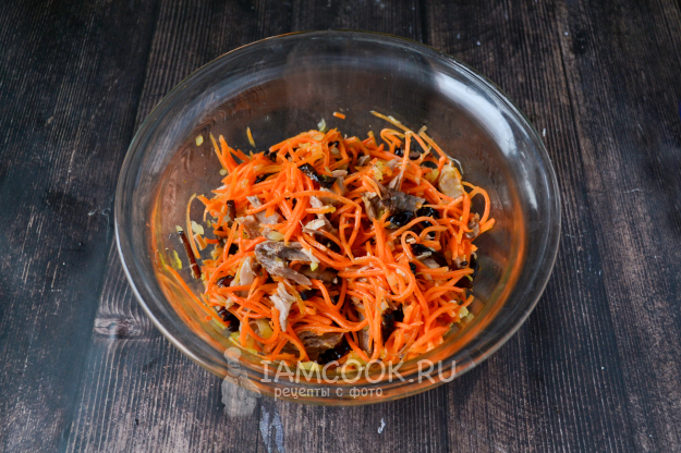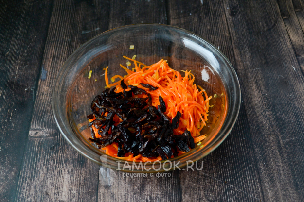 Положите в салатник охлажденную морковь с луком. Чернослив нарежьте тонкими полосками, добавьте в салатник.