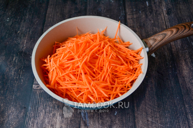 Положите в сковороду к луку морковь. Перемешайте. На огне чуть выше среднего, постоянно перемешивая, прогревайте морковь 5-6 минут. Морковь не жарится, она должна просто стать мягче. Охладите.