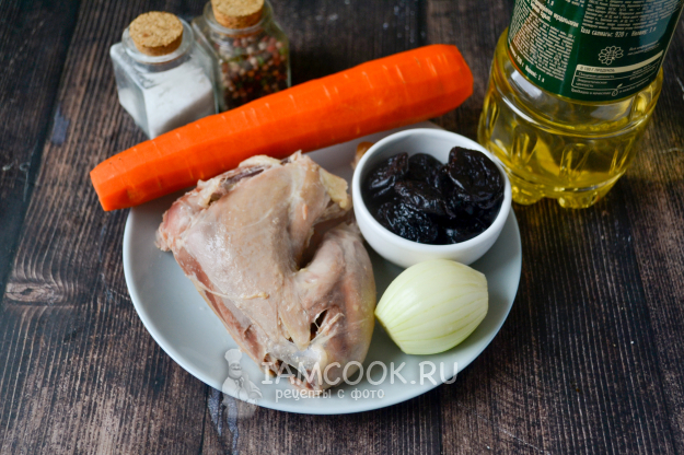 Соберите продукты для приготовления морковного салата с курицей. Для салата можно взять любую часть куриной тушки, которую заранее отварите до готовности в подсоленной воде и полностью охладите. Чернослив тщательно промойте и обсушите. Если он очень сухой, то залейте прохладной водой на 10-15 минут, после чего обсушите. Морковь и лук почистите и вымойте.