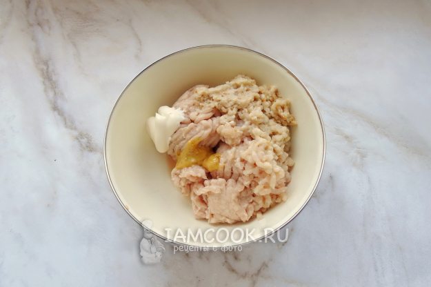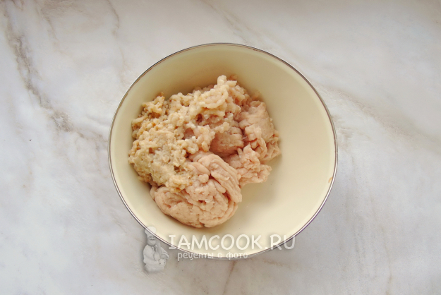 Белый батон замочите в холодной кипяченой воде и через 5 минут отожмите. Пропустите через мясорубку и добавьте в миску с куриным фаршем.
