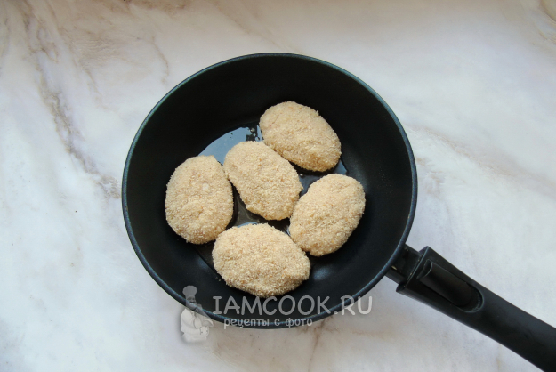 Из приготовленного фарша сформируйте овальные котлеты и обваляйте их в панировочных сухарях. Поместите на горячую сковороду с растительным маслом.