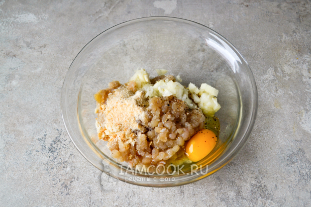 В миску с рыбным фаршем положите мелко нарезанный репчатый лук, всыпьте панировочные сухари, вбейте яйцо, посолите и поперчите.