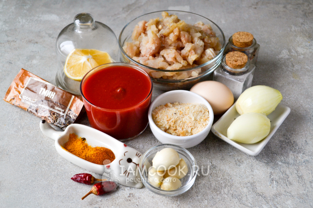 Продукты для приготовления храйме с рыбными тефтельками соберите по списку. Фарш может быть из минтая, трески, судака. Вместо свежих томатов использую домашний томатный сок. Из специй - чеснок, красный острый перец (который и придаст соусе ту самую пикантность и остроту), тмин, паприку, куркуму, черный молотый перец.
