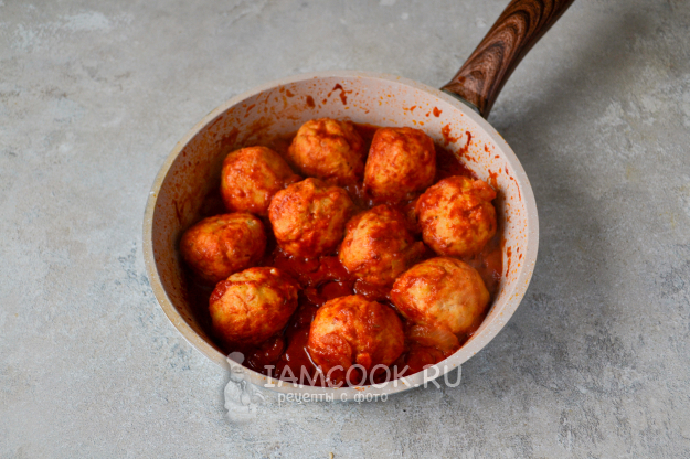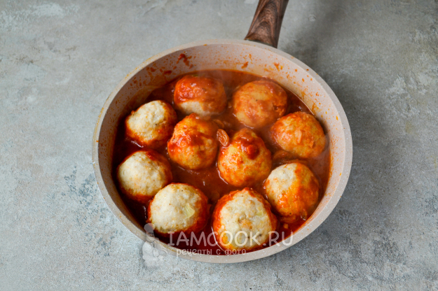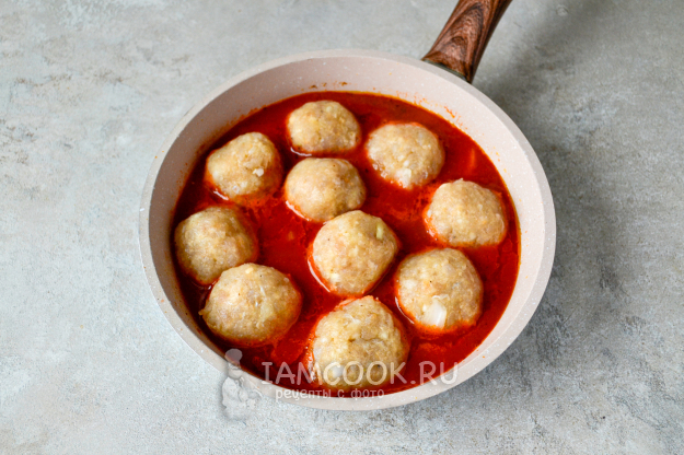 Доведите соус до кипения, проварите пару минут и положите сформованные из фарша небольшие тефтельки.