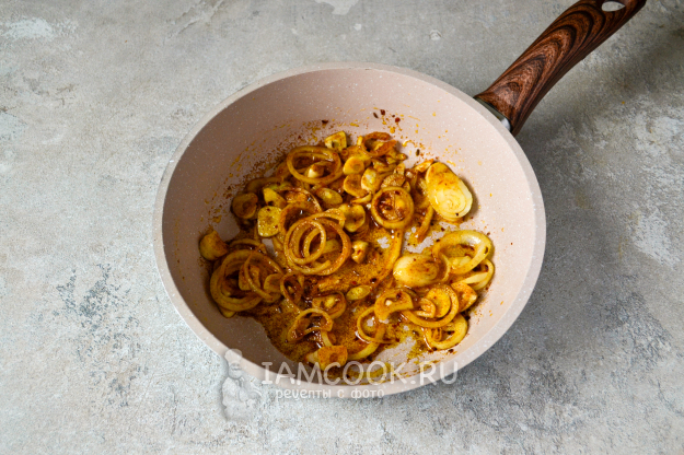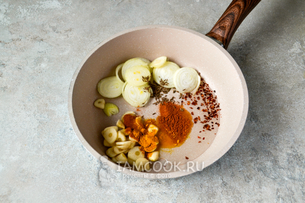 В сковороду с разогретым растительным маслом положите нарезанный репчатый лук, чеснок, красный острый перец, тмин, паприку и куркуму.