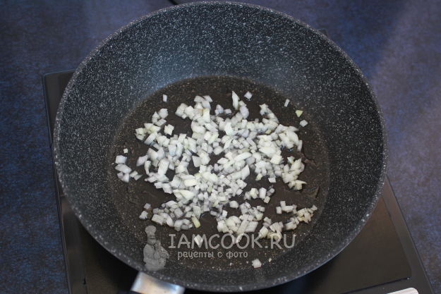 Лук мелко нашинкуйте и потомите на сливочном или топлёном масле на среднем или слабом огне около пяти минут при помешивании. Посолите.