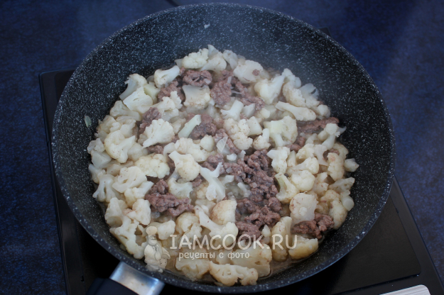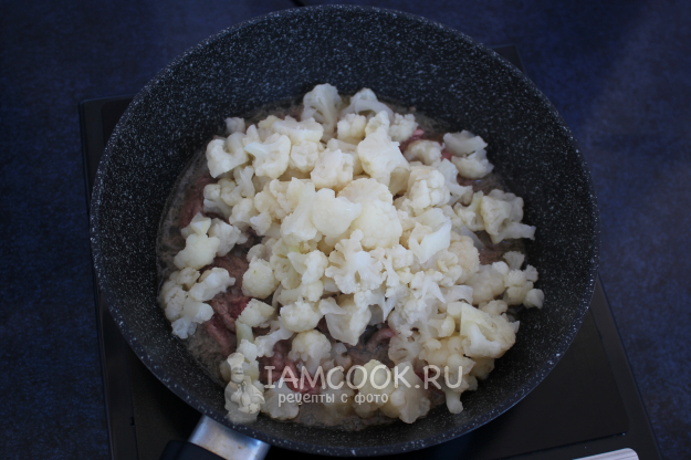 Цветную капусту, не размороженную до конца, а лишь бы получалось её соцветия порезать на удобные кусочки поменьше, отправьте на сковороду к остальным ингредиентам.