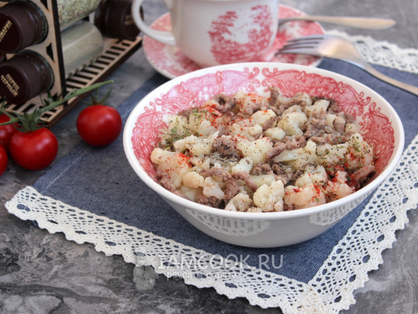 Подготовьте ингредиенты по списку к рецепту. Цветную капусту предлагаю взять более доступную - замороженную. Фарш подходит самодельный или покупной и не только говяжий. Специи каждая хозяйка может выбирать на своё усмотрение.