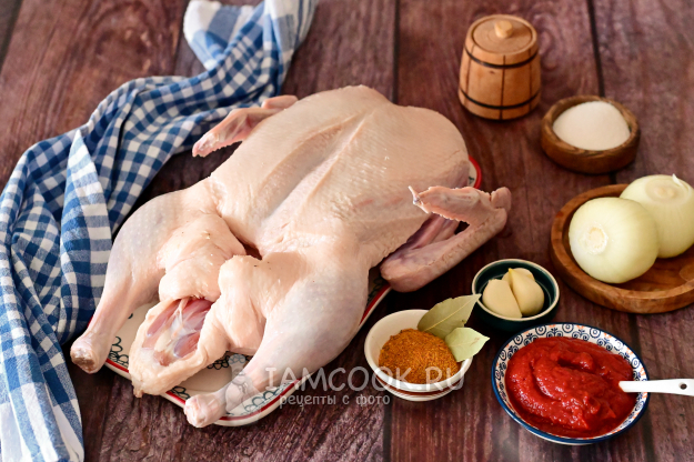 Соберите необходимые продукты и будем готовить вкуснейшую тушеную утку в томатном соусе.