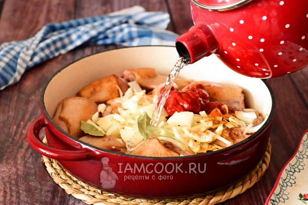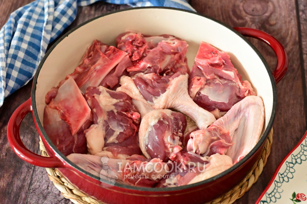 Влейте в сотейник горячую воду из чайника вровень с кусочками утки. Количество воды - на своё усмотрение, всё зависит от того, сколько соуса вы хотите получить в итоге.