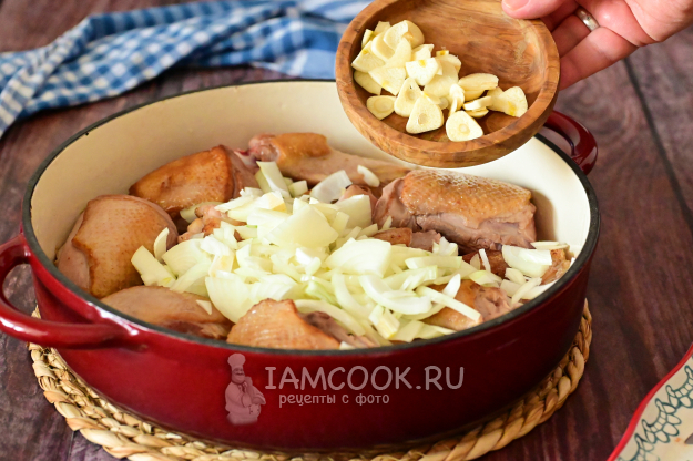 Затем в сотейник к обжаренным кусочкам утки добавьте нарезанный лук и чеснок.
