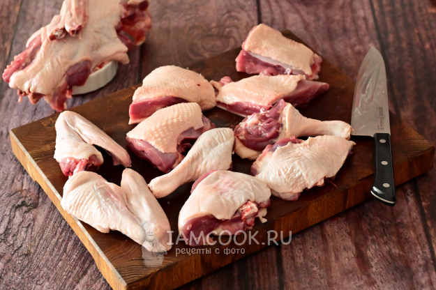 Тушку утки нужно разделать на кусочки. Подробно этот процесс я показала в видео, но постараюсь сейчас словами объяснить более-менее понятно.