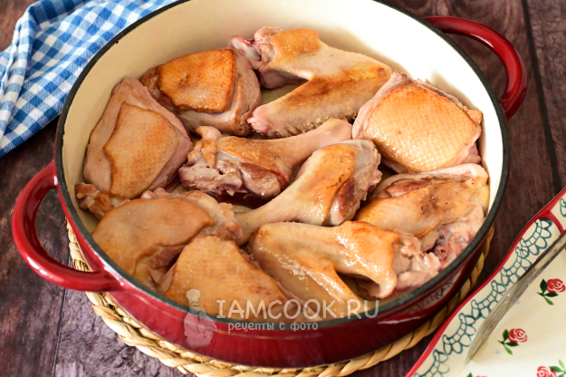 Возьмите глубокую сковороду или сотейник. Разогрейте его без масла (в утке достаточно своего жира). В раскаленный сотейник выложите куски утки кожей вниз.
