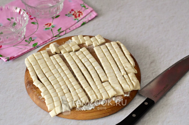 Чуть припылите доску мукой, выложите на нее пласт слоеного теста. Раскатывать тесто не нужно. Нарежьте тесто вначале на полоски по 1 сантиметру, а затем на квадратики со стороной 1 сантиметр.