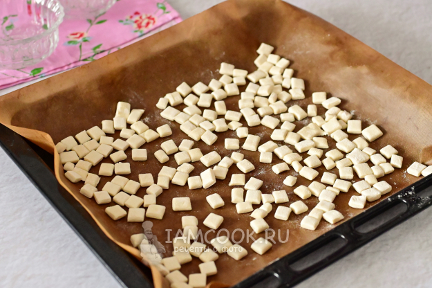 На противень, застеленный ковриком для выпечки или пергаментом, выложите квадратики теста в один слой.
