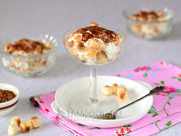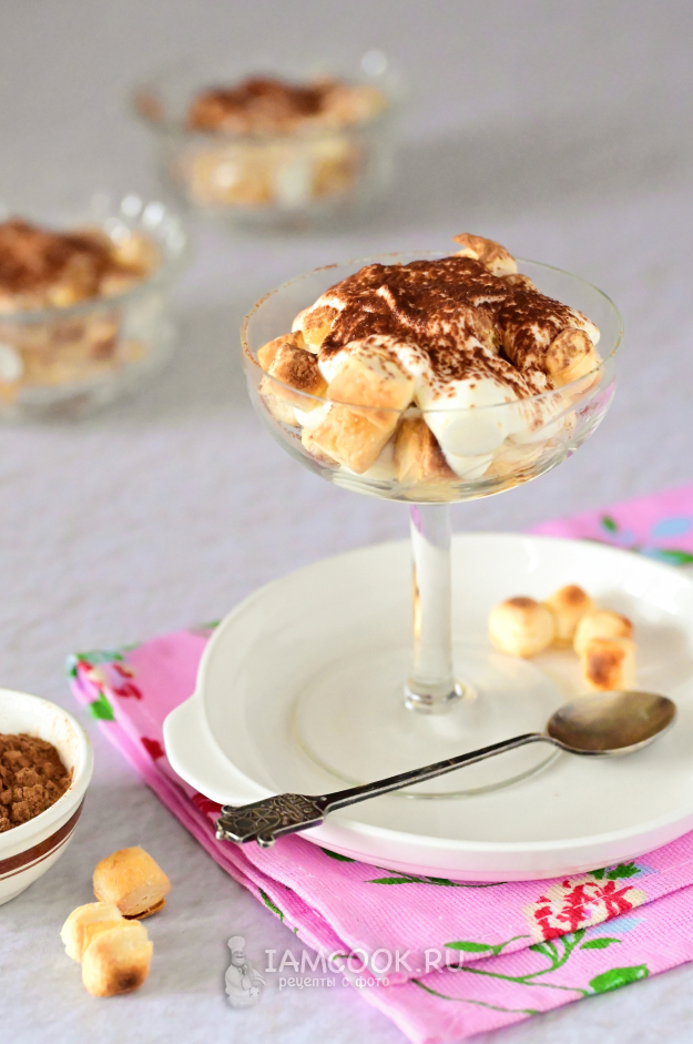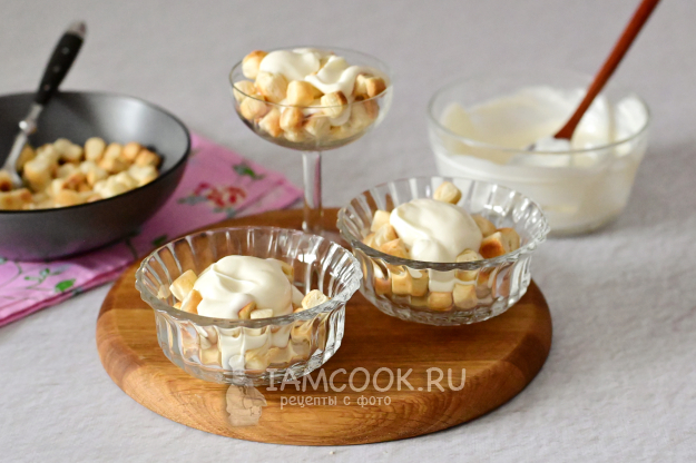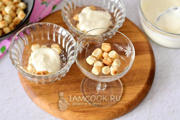 Ну а дальше всё просто: возьмите креманки или красивые стаканы и выкладывайте слоями пышечки и крем.