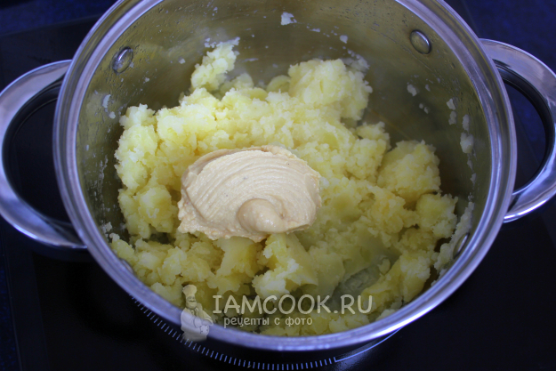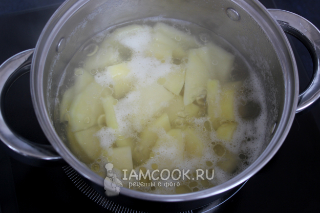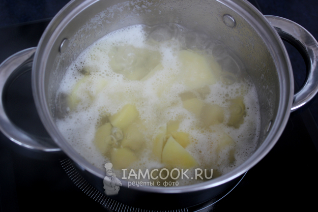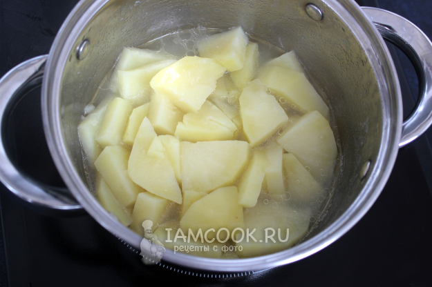 С готового картофеля слейте бульон в кружку, а сам картофель разомните.