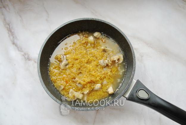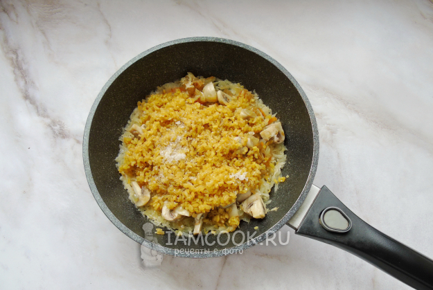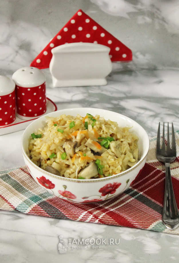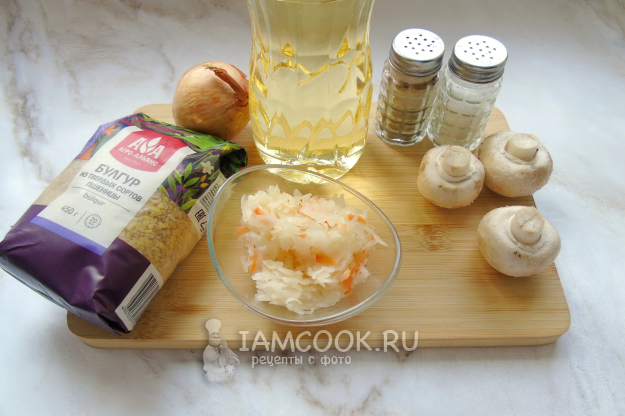 Соберите ингредиенты для приготовления булгура с квашеной капустой и грибами.