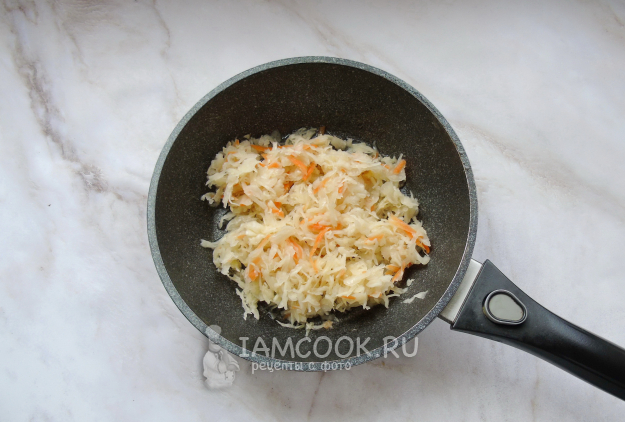 Переложите лук с грибами на тарелку. А в сковороду выложите квашеную капусту, которую предварительно отожмите от рассола. Налейте 50 мл воды, накройте сковороду крышкой и тушите капусту на небольшом огне 15 минут.