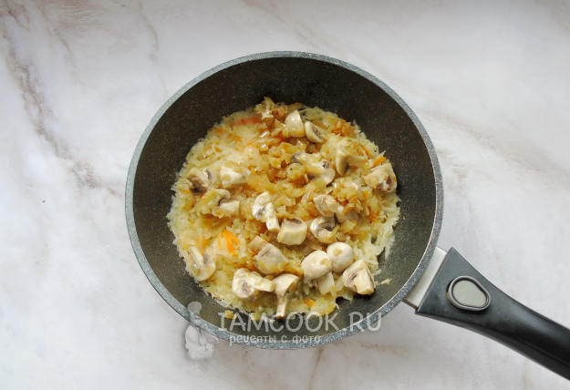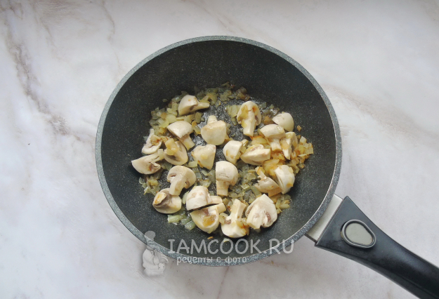 Жарьте лук до прозрачности. Грибы очистите и нарежьте произвольно. Добавьте в сковороду с луком.