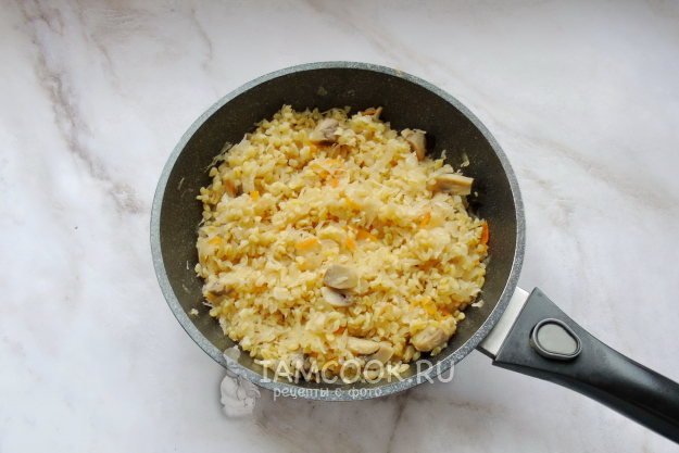 Накройте сковороду крышкой и готовьте булгур с квашеной капустой 25-30 минут на небольшом огне, до испарения жидкости.