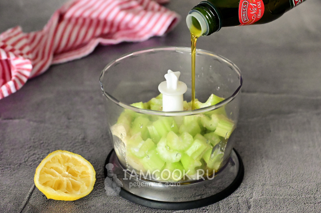 Соус готовится в блендере. Для облегчения его работы стебли сельдерея и чеснок нарежьте на небольшие кусочки.