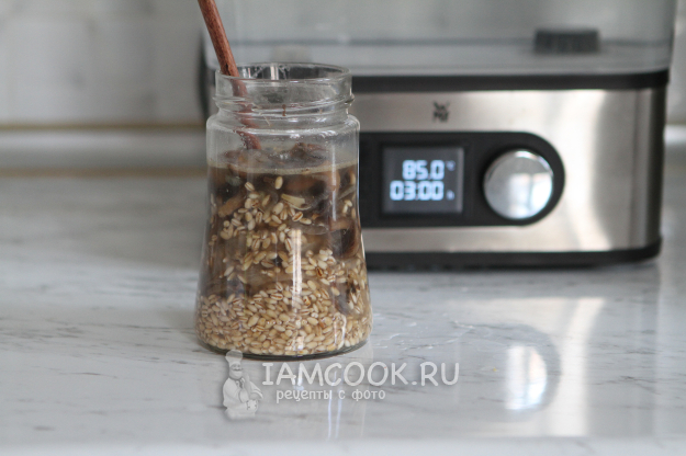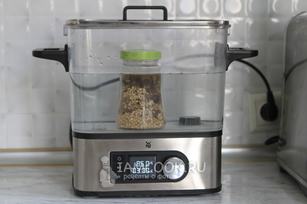 Нагрела воду до 85 градусов. Когда вода нагрелась до нужной температуры, установила банку с перловкой и готовила 3 часа.