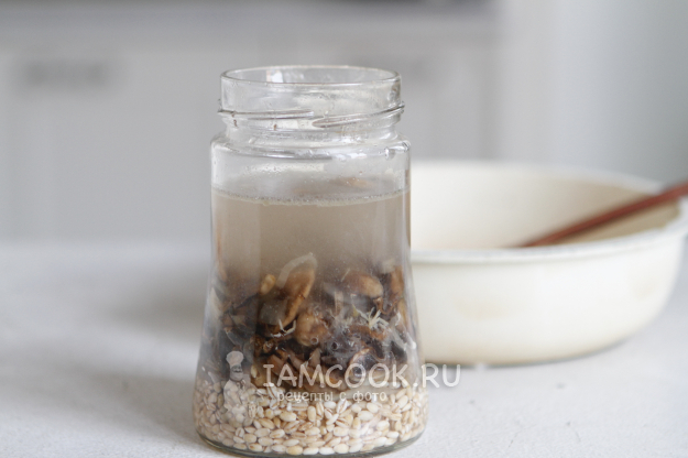 Перловку промойте под проточной водой и переложите в банку. Объем банки должен быть больше общего объема продуктов.
