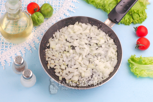 Очистите лук и зубчик чеснока, нарежьте лук мелкими кубиками, а чеснок измельчите или спрессуйте, и обжарьте все на сковороде в растительном масле примерно 4-5 минут. Время от времени перемешивайте нарезки, чтобы они не подгорели. Как только они подрумянятся - выключите нагрев.