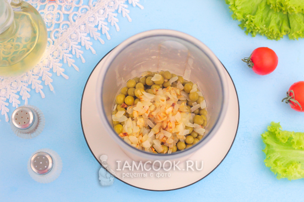 Выложите в стакан для блендера консервированный зеленый горошек, но маринад пока что не вливайте.