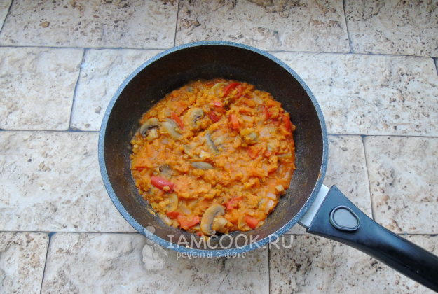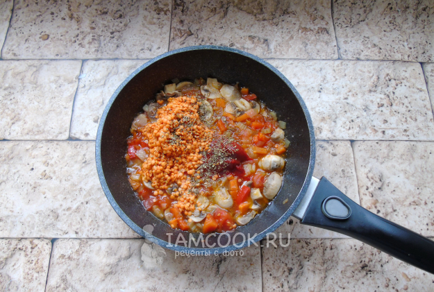 Чечевицу помойте и выложите в сковороду с овощами. Добавьте томатную пасту и приправы. У меня была итальянская приправа. Её можно заменить сушеным базиликом с орегано и мускатным орехом. Налейте овощной бульон или воду.