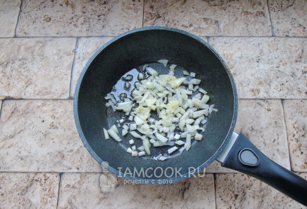 Репчатый лук и чеснок очистите и помойте. Лук мелко нарежьте, а чеснок измельчите любым способом. Выложите в сковороду с оливковым маслом. Пассеруйте до прозрачности лука.