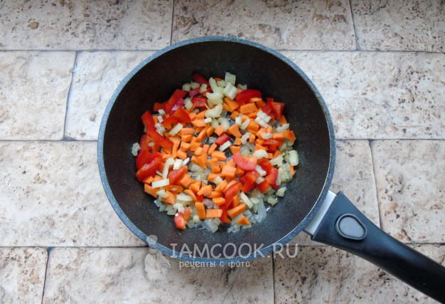 Морковь очистите и помойте, нарежьте кубиками. Болгарский перец очистите от белых перегородок и семян. Нарежьте произвольно, но не крупно. Тушите овощи 5-6 минут.