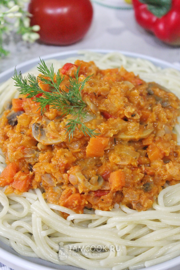 Вегетарианский соус болоньезе готов. Спагетти отварите по инструкции на упаковке. Подавайте с соусом.