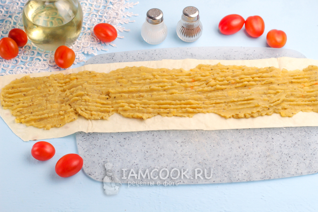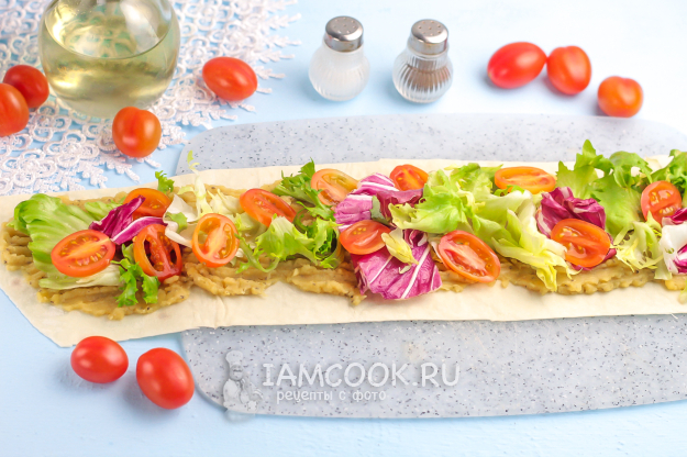 Каждую ленту лаваша обмажьте хумусом, отступая от края примерно 1-1,5 см.
