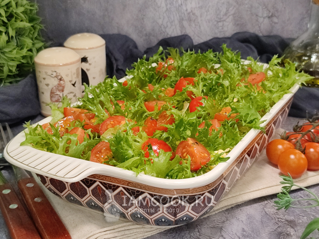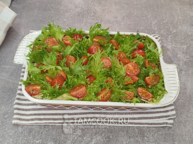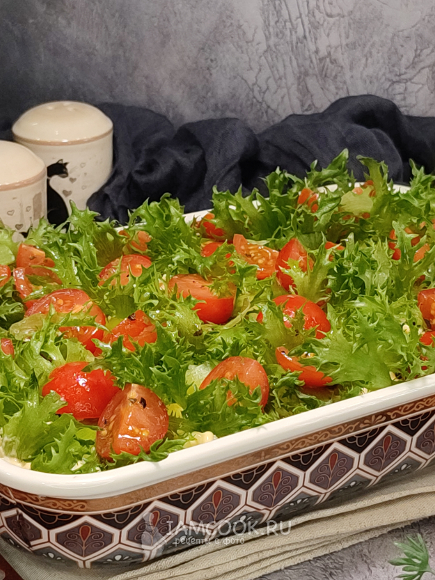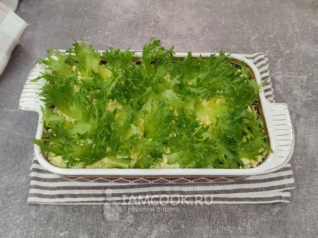Перед подачей верх салата украсим вымытыми и обсушенными листочками салата.