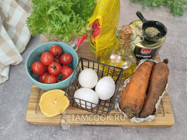 Соберите ингредиенты для приготовления салата с консервированной ветчиной. Корнеплоды для салатов я всегда отвариваю или запекаю накануне вечером, морковь в данном случае я запекла в фольге при 200 градусах в течение 40 минут. Яйца отварила вкрутую, около 7 минут. Листовой салат берите любой, какой нравится, у меня фриллис.