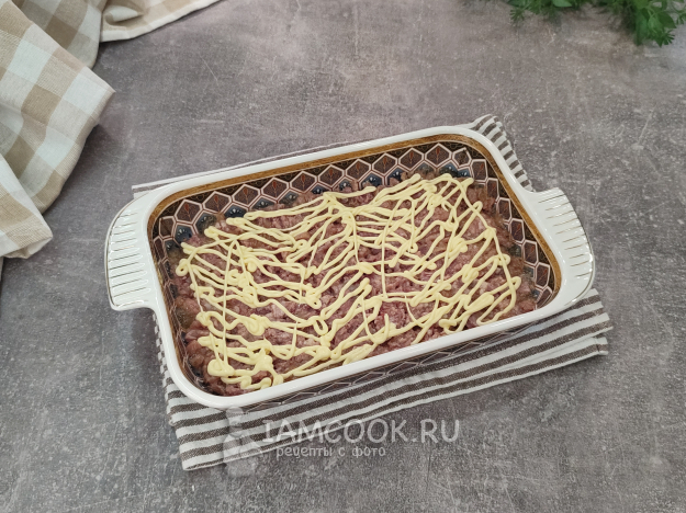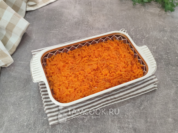 Далее на крупной терке натираем морковь, слегка присолим, сверху нанесем сеточку майонеза.