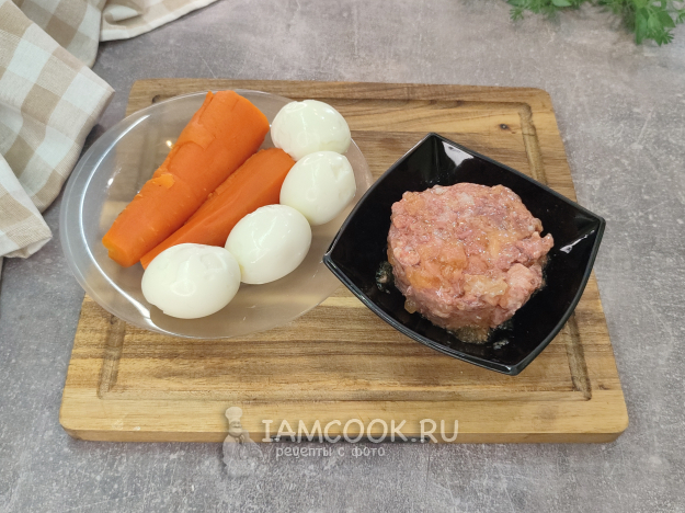 Морковь и яйца очищаем, у ветчины уберем лишний жир, есть он имеется.