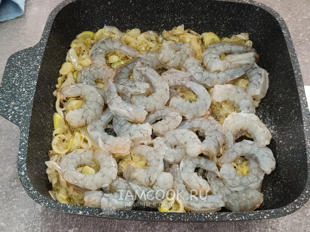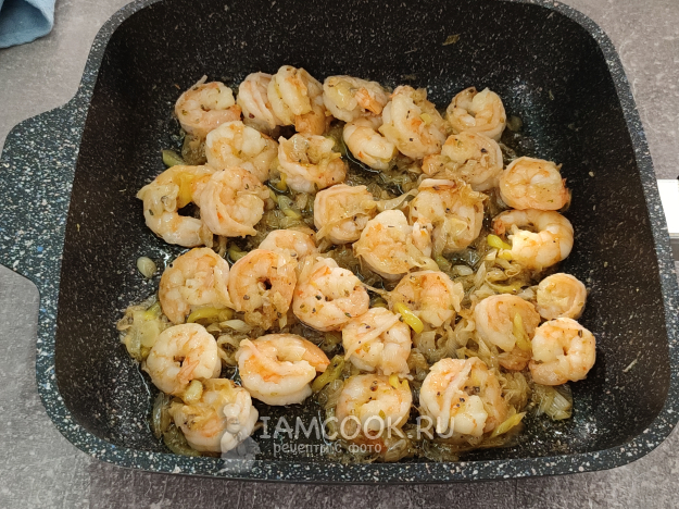 Выложите в сковороду креветки.