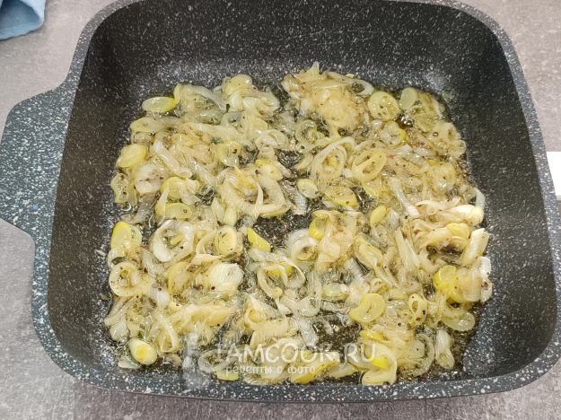 В сковороде разогрейте оливковое и сливочное масла, выложите лук, обжарьте, помешивая, до мягкости.