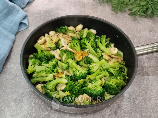 К грибам добавьте брокколи, обжарьте, помешивая, минут 5-7, капуста станет мягче, но при этом останется слегка хрустящей.
